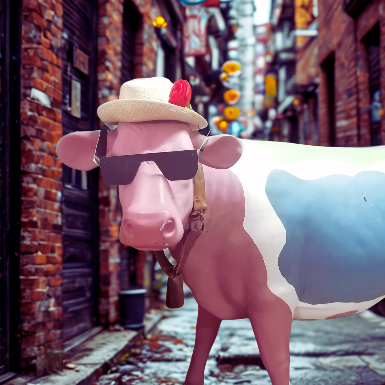 Doesn’t describe herself, as she is a big fibre glass cow. But if she could, she would strongly object to the idea that her farts are destroying the world. Moo.